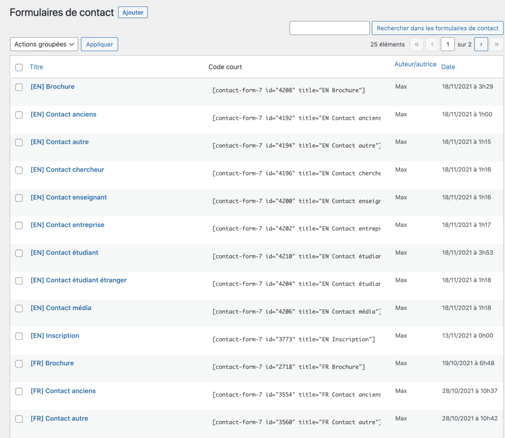 L’ensemble des formulaires du site internet sont géré dans l’onglet « Contact » du back-office.